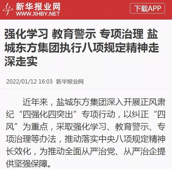 112日,新華報(bào)業(yè)網(wǎng)關(guān)注報(bào)道鹽城東方集團(tuán)落實(shí)中央八項(xiàng)規(guī)定精神長(zhǎng)效化重要舉措。