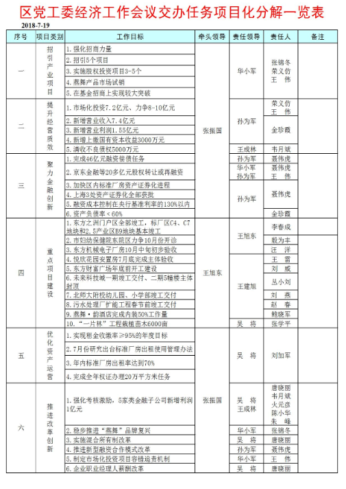二、千方百計(jì)提升經(jīng)營質(zhì)效。下半年,必須不折不扣完成市場化投資7.2億元、營業(yè)收入7.4億元、營業(yè)利潤1.55億元任務(wù);鎖定重點(diǎn)事項(xiàng),確保完成8000萬元不良債權(quán)清收任務(wù);提前研判市場,確保70億元融資償債任務(wù)完成;提升融資質(zhì)效,融資成本控制在央行基準(zhǔn)利率的130%以內(nèi),確保直融占比75%以上、持續(xù)保持大市區(qū)最優(yōu);優(yōu)化財(cái)務(wù)結(jié)構(gòu),確保負(fù)債率控制在60%以內(nèi);積極對接市場,力爭上海3處資產(chǎn)證券化年內(nèi)全部獲批,同步推進(jìn)京東金融等20多億元股權(quán)轉(zhuǎn)讓或再融資,加快區(qū)內(nèi)100多萬平方米標(biāo)準(zhǔn)廠房資產(chǎn)證券化進(jìn)程;持有房產(chǎn)經(jīng)營方面,要圍繞租金收繳率不低于95%的年度目標(biāo)、研究出臺(tái)標(biāo)準(zhǔn)化廠房出租使用管理辦法、年內(nèi)標(biāo)準(zhǔn)化廠房出租率要達(dá)到70%、權(quán)證辦理20萬平方米以上的目標(biāo)發(fā)力推進(jìn)。