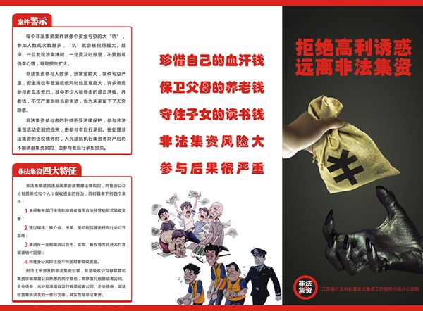 希望廣大人民群眾都能積極投身到防范和打擊非法集資的行為中來,認真學習和掌握非法集資的特征,做到“三看三思三不要”。切實認清非法集資的本質和危害,自覺增強防范意識、理性投資意識,堅信“天下沒有免費的午餐”,切記“你惦記他的高額回報,他惦記你投入的本金”,高收益往往伴隨著高風險,自覺抵制各種誘惑,依法保護自身權益。對高額回報、快速致富的投資項目要冷靜分析、三思而后行,多向專業機構、專業人士咨詢;對不熟悉的理財項目或公司要多問幾個“為什么”,究竟有沒有權威部門的批準,經營范圍有哪些,到底違不違反國家法律,決不輕信高額利息的許諾,真正做到珍惜辛苦錢、守好血汗錢,遠離非法集資活動。同時,要增強風險自擔意識,謹記參與非法集資造成的損失要自行承擔。