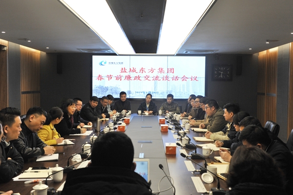 1月29日上午,鹽城東方集團在集團7樓會議室召開春節前廉政交流談話會議,區紀工委監察工委第三紀檢監察室主任張梅、科長葛峰出席會議并提出相關要求。集團各部門、子公司負責人參加會議。