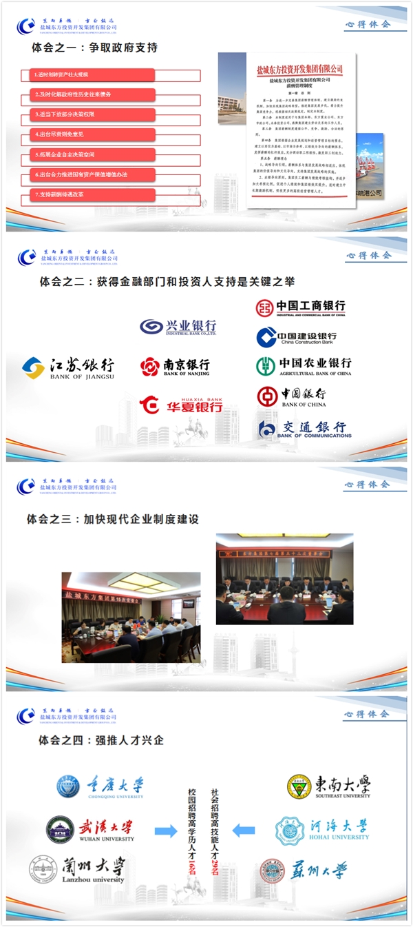 鹽城東方轉(zhuǎn)型發(fā)展除了內(nèi)生動力得到充分激發(fā)、把準(zhǔn)了幾個重要機(jī)遇外,還得益于黨委、政府的堅強(qiáng)領(lǐng)導(dǎo),更得益于和像江蘇銀行這樣的金融機(jī)構(gòu)的鼎力扶持。主要心得體會有:一是爭取政府支持是重要保障。二是獲得金融部門和投資人支持是關(guān)鍵之舉。三是加快現(xiàn)代企業(yè)制度建設(shè)是有力支撐。四是強(qiáng)推人才興企是轉(zhuǎn)型根本。