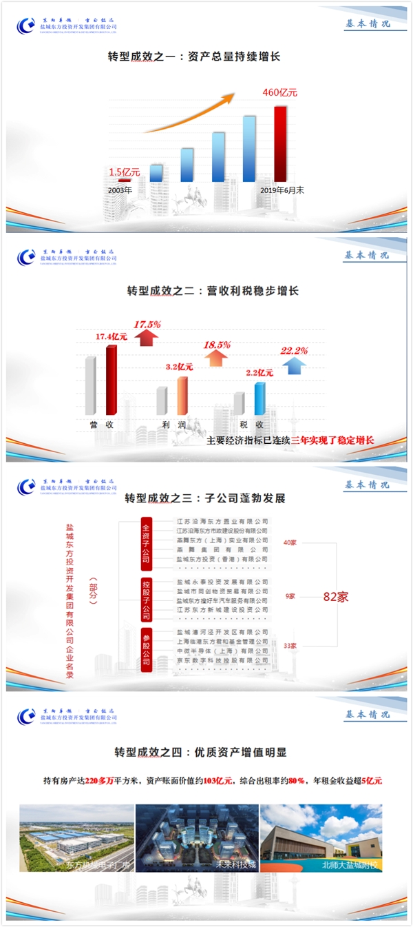 從基本情況來看,鹽城東方集團(tuán)經(jīng)過16年的發(fā)展,目前已從單純政府投融資平臺,向市場化、實(shí)體型、投資型、效益型、品牌型實(shí)業(yè)國有企業(yè)轉(zhuǎn)型。十多年來,鹽城東方集團(tuán)強(qiáng)推“六化”促轉(zhuǎn)型,謀求發(fā)展高質(zhì)量。即以穩(wěn)增長為導(dǎo)向、加快規(guī)模化擴(kuò)張,以走出去為動能、提速外向化開拓,以調(diào)結(jié)構(gòu)為引擎、激活高效化混改,以主板塊為支撐、強(qiáng)推實(shí)體化運(yùn)行,以防風(fēng)險為保障、加速規(guī)范化進(jìn)程,以創(chuàng)特色為方向、加快品牌化塑造,主要取得四個方面的轉(zhuǎn)型成效:一是資產(chǎn)總量持續(xù)增長。二是營收利稅穩(wěn)步增長。三是子公司較快發(fā)展。四是優(yōu)質(zhì)資產(chǎn)增值明顯。