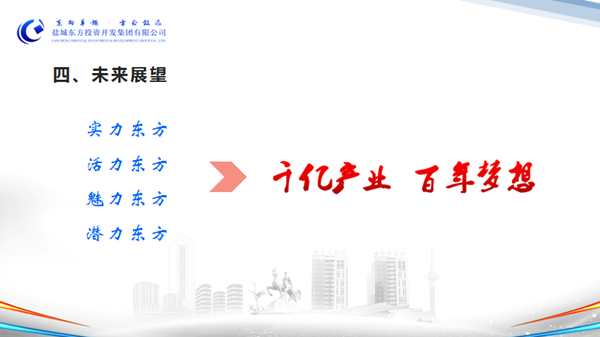 當(dāng)前,鹽城東方集團(tuán)所在的鹽城經(jīng)開區(qū),恰逢國務(wù)院和省、市政府全力支持推進(jìn)中韓(鹽城)產(chǎn)業(yè)園建設(shè)的黃金機(jī)遇,在“天時、地利、人和”的難得良機(jī)前,對于未來,東方集團(tuán)將堅定不移地選擇主動轉(zhuǎn)、穩(wěn)健轉(zhuǎn)、高效轉(zhuǎn),樹立打造“千億產(chǎn)業(yè)•百年夢想”美好愿景。