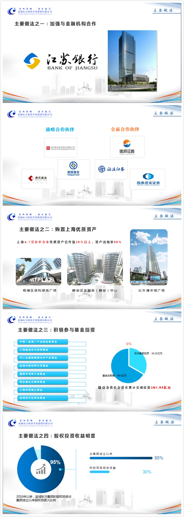 近三年以來,鹽城東方集團(tuán)圍繞產(chǎn)業(yè)化、實(shí)業(yè)化、市場化追求,主動接軌上海、加快投資步伐、謀求多元發(fā)展,初步展現(xiàn)提質(zhì)增效、轉(zhuǎn)型創(chuàng)新的綜合成效和后發(fā)優(yōu)勢。主要做法有:一是加強(qiáng)與金融機(jī)構(gòu)合作。二是購置上海優(yōu)質(zhì)資產(chǎn)。三是積極參與基金投資。四是股權(quán)投資收益明顯。五是子公司市場化發(fā)展。六是收購上市公司與啟動自主上市。