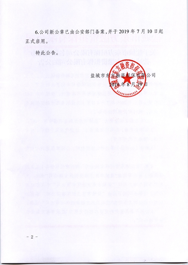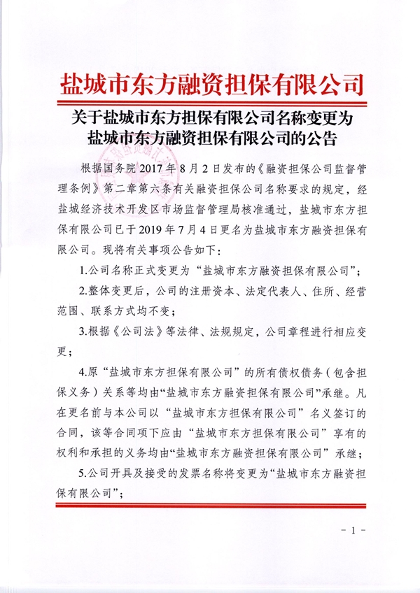 關(guān)于鹽城市東方擔(dān)保有限公司名稱變更為鹽城市東方融資擔(dān)保有限公司的公告