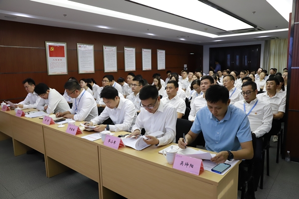 區黨工委主題教育第三指導組成員參加會議,集團各部門、子公司中層以上人員以及全體黨員等參加會議。