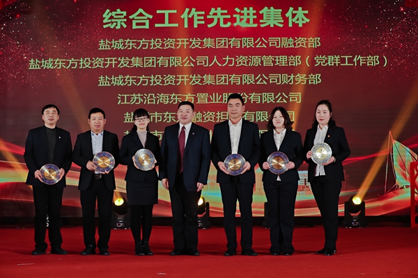 鹽城東方集團黨委書記、董事長張振國為“綜合工作先進集體”代表頒獎。