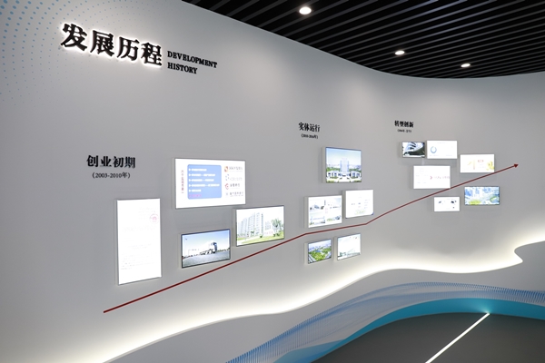 正中區域采用了通電玻璃、三維攝影、分屏展示等現代科技手段,與流線型“芯時代”光帶相呼應,充分彰顯了集團科技化應用。在“發展歷程回眸”功能區,展示了集團“創業初期”“ 實體運行”“ 轉型創新”三個不同階段的發展亮點。