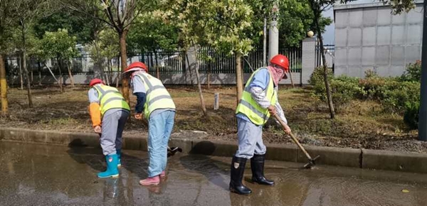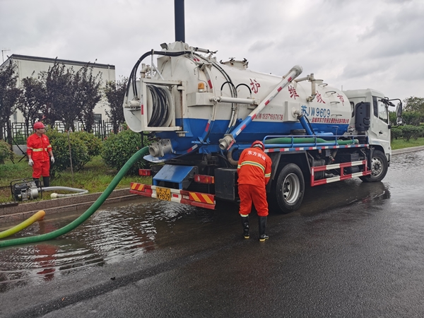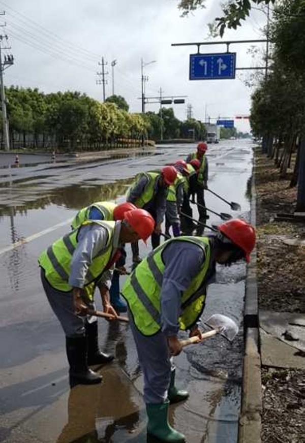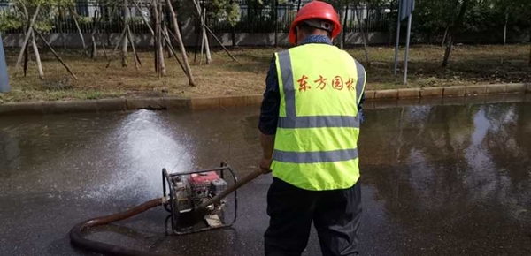 6月29日凌晨5點,東方園林出動皮卡工程車5輛,汽油抽水泵4臺,挖機一臺。5人負責招商中心抽水排澇,23人赴鹽瀆路抽水排澇保障當日活動,各路段84人巡查扶樹,扶樹共計137棵。