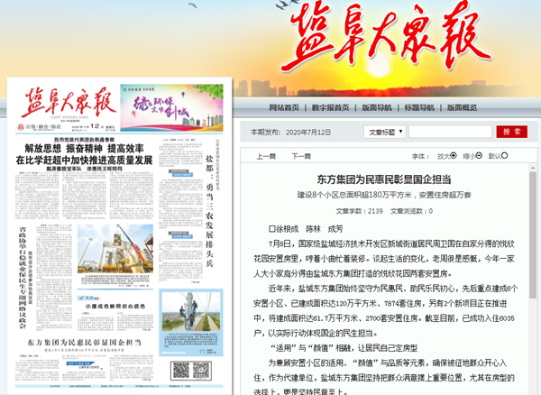 2020年6月28日《新華日?qǐng)?bào)》第4版:“一線視點(diǎn)”刊發(fā)《鹽城東方集團(tuán)展國(guó)企擔(dān)當(dāng),讓5萬余被征地群眾“安居”》。
