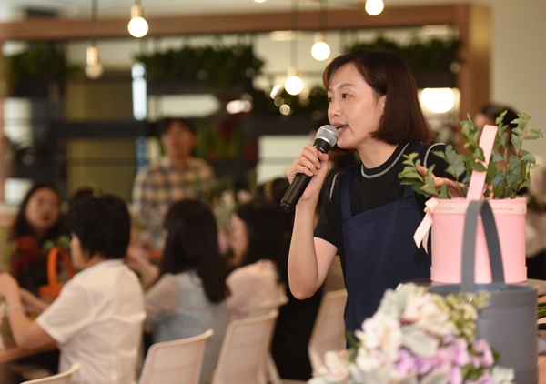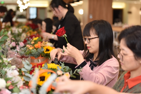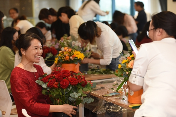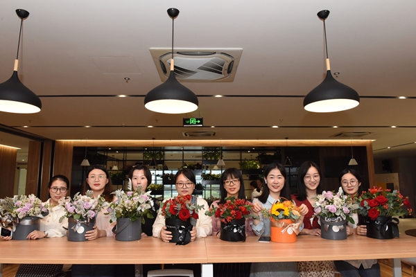 在花藝老師的講解和指導下,女職工們熱情高漲,發揮對美的想象和創意,全身心地投入作品創作中。將花卉精心地修剪、整枝,經過系列藝術加工,一朵朵鮮花、一片片綠枝,在一雙雙巧手的擺弄中錯落有致地插在一起,花藝課堂彌漫著淡淡的香氣,一盆盆燦爛繽紛、溫馨秀美的花藝作品“新鮮出爐”,大家手捧著自己的得意之作,臉上洋溢著喜悅之情。