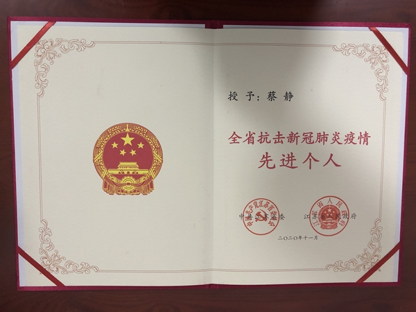 鹽城東方集團旗下鹽城市東方物業有限公司項目經理蔡靜同志榮獲“全省抗擊新冠肺炎疫情先進個人”稱號。