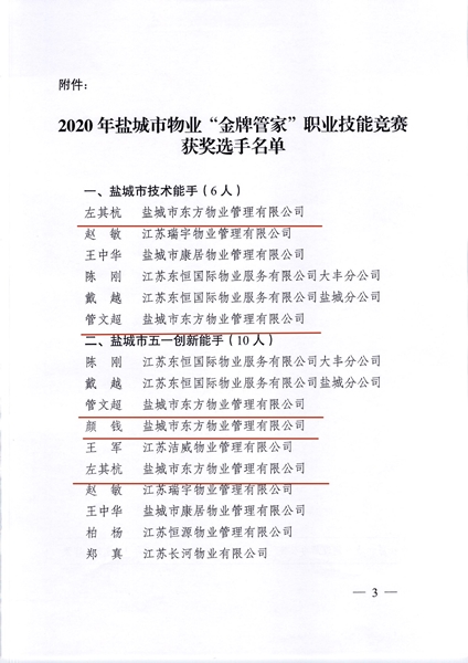 日前,鹽城市住建局、市人社局、市總工會聯(lián)合發(fā)布《2020年鹽城市物業(yè)“金牌管家”職業(yè)技能競賽獲獎選手名單的通知》,鹽城市東方物業(yè)管理有限公司3名選手榜上有名。其中,東方物業(yè)副總經(jīng)理左其杭、東方物業(yè)工程部設(shè)備維護員管文超兩人均獲得“鹽城市技術(shù)能手”“鹽城市五一創(chuàng)新能手”稱號,東方物業(yè)工程部工程維修管理員顏錢獲得“鹽城市五一創(chuàng)新能手”稱號。