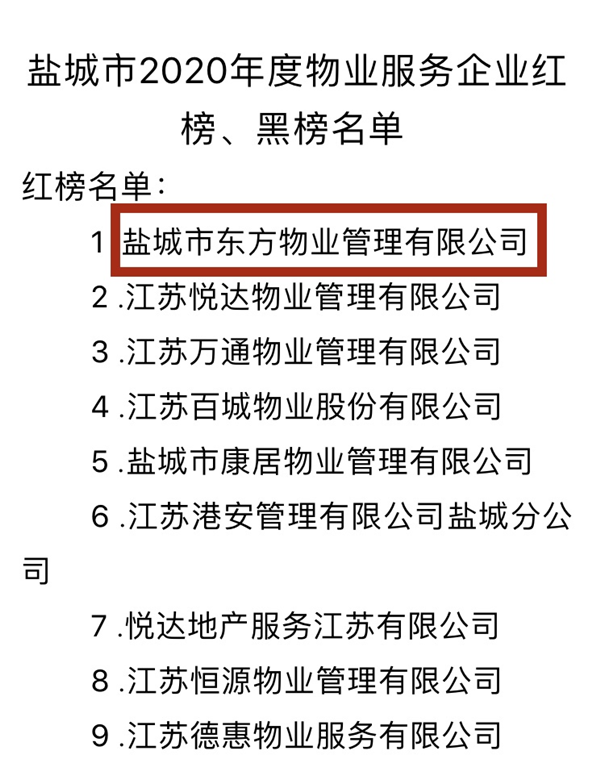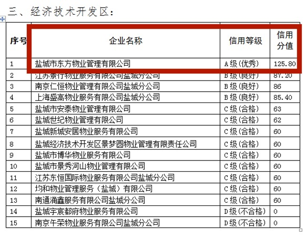 日前,鹽城市住建局發(fā)布《關(guān)于公布2020年度物業(yè)服務(wù)企業(yè)信用等級(jí)和紅黑榜名單的通知》,公示鹽城市2020年度物業(yè)服務(wù)企業(yè)信用綜合評(píng)價(jià)結(jié)果。全市共有589家物業(yè)服務(wù)企業(yè)參加評(píng)定,鹽城市東方物業(yè)管理有限公司以125.8分的優(yōu)異成績(jī)順利通過(guò)鹽城市物業(yè)服務(wù)行業(yè)綜合監(jiān)管平臺(tái)測(cè)評(píng),獲得鹽城市2020年度物業(yè)服務(wù)企業(yè)信用等級(jí)A級(jí)認(rèn)證,并榮登鹽城市2020年度物業(yè)服務(wù)企業(yè)紅榜榜首。