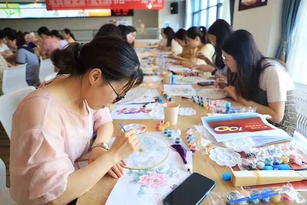 巧手繪扇面,濃情頌黨恩。當(dāng)天下午3點(diǎn),手繪團(tuán)扇活動(dòng)在一片歡聲笑語(yǔ)中進(jìn)行。100余名女員工興高采烈地來(lái)到三樓員工餐廳,互相交流畫(huà)什么內(nèi)容,表達(dá)自己的心聲。活動(dòng)中,大家認(rèn)真思考、用心作畫(huà)。勾勒、配色、描摹,圖案輪廓在筆尖的勾勒下漸顯形態(tài),蒼翠的青竹、傲立的臘梅、清雅的荷花躍然扇面之上。有的人則繪出黨徽、黨旗圖案,巧妙嵌入“100”字樣,直抒胸臆表達(dá)對(duì)建黨100周年的歡喜之情。