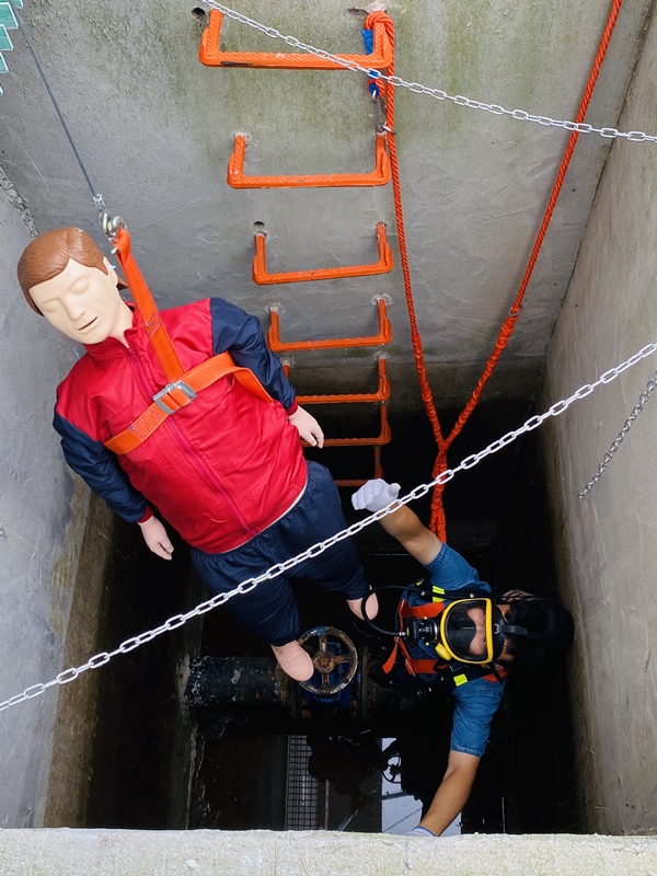 水務公司總經理沈效偉宣布演練開始。作業流程審批、現場安全教育、防護用具穿戴、井蓋通風、氣體檢測、通訊設備調試、安全監護等整個演示過程井然有序,規范嚴謹。隨后,模擬作業人員窒息,下井作業人員因硫化氫中毒昏倒在井內,作業負責人按要求上報,啟動應急預案,救援組到達現場后,救援人員將防護服、氧氣管、報警器等穿戴整齊后下入井內,再將窒息者通過三腳架提升起來,轉移到空氣新鮮地方,使其平躺,由救護人員模擬心肺復蘇,經過半個小時緊張有序的演練,“傷員”得到有效救治,事故得到有效處置。過程中指導人員提醒注意事項,參與演習人員分別親自上手進行了模擬救援。