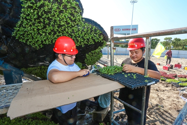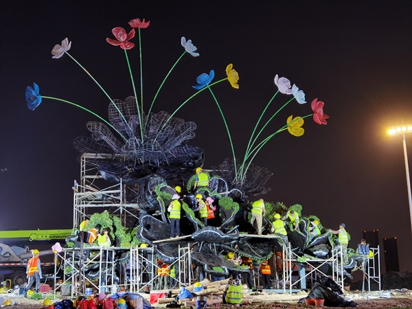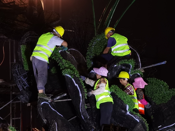 因連遇大風(fēng)降雨天氣,給施工安全實施帶來很大難度。為此,東方園林制定嚴(yán)格的安全預(yù)案,安全措施先行,安排專職安全管理人員和監(jiān)理值守現(xiàn)場,確保新布置的硬質(zhì)景觀安全、平穩(wěn)、順利運行。國慶期間,參施員工克服困難,放棄了和家人團(tuán)聚的機(jī)會,向圓滿完成任務(wù)沖刺。經(jīng)過建設(shè)全程的精心調(diào)度、協(xié)調(diào)和園丁們的匠心巧藝,“如意牡丹”綠雕項目如期“綻放”。