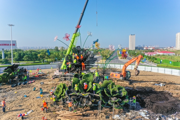 自9月3日接到任務(wù)后,鹽城東方集團(tuán)高度重視,集團(tuán)黨委書記、董事長、總經(jīng)理王旭東靠前指揮,第一時間對任務(wù)進(jìn)行部署,要求東方園林公司高標(biāo)準(zhǔn)完成新都路大轉(zhuǎn)盤綠雕提升改造任務(wù)。集團(tuán)黨委委員、副總經(jīng)理吳將細(xì)化任務(wù)、精心組織,帶領(lǐng)東方園林團(tuán)隊立即赴城南海棠園雕塑工程、新都路通榆河雕塑工程實地考察學(xué)習(xí),快速確定設(shè)計施工一體化單位。開工前,東方園林積極與交警五大隊、區(qū)行政執(zhí)法局、水務(wù)公司、供電局等相關(guān)部門進(jìn)行溝通協(xié)調(diào),確保場外加工不受干擾,保障進(jìn)場安裝道路暢通和現(xiàn)場施工順利進(jìn)行。9月16日設(shè)計方案確定后,東方園林聯(lián)系景觀設(shè)計方抓緊時間對方案進(jìn)行深化,落實到施工圖;與鋼結(jié)構(gòu)材料供應(yīng)商、上海花卉基地以及主要技術(shù)工人做好施工的溝通工作。施工前對鋼筋方管的尺寸規(guī)格上做了優(yōu)化,焊接造型進(jìn)行邊探討邊修改,確保架構(gòu)能百分百承受綠植。