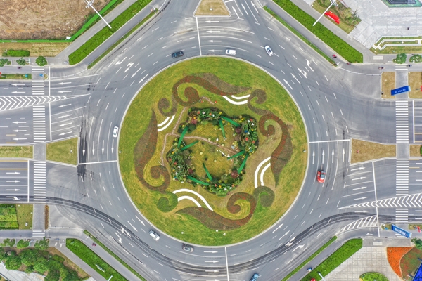 主題綠雕“如意牡丹”位于新都路和希望大道交叉口環(huán)島花壇內(nèi),最高點達(dá)15米,設(shè)計采用中式紋樣的傳統(tǒng)構(gòu)圖,分為東南西北四個路口布置花卉對景,花朵均朝向車行來方向,令行人賞心悅目。在充分考慮環(huán)島交通功能和周邊建筑景觀融合的基礎(chǔ)上,把握“綠色生態(tài)”“寓意鮮明”的原則,選定鹽城市市花之一牡丹作為綠雕形象主題。結(jié)合“卷草如意”圖案的模紋花帶,形成現(xiàn)代大氣的城市景觀花壇,寓意“花開富貴送吉祥,國泰民安如意來”;以17朵植物綠雕制作的“牡丹”組成大型花裙,通過綠色的植物拱橋延綿相連,寓意“綠水青山”;花壇內(nèi)部設(shè)計為“十全十美”如意球,花壇外圍采用流線型的卷草如意花帶,色彩靚麗并具有交通引導(dǎo)功能。地形飽滿的模紋花帶,既滿足車行視線,又滿足視覺效果;景觀中心迸發(fā)出點點繽紛的小花朵,迎風(fēng)飄逸,為整體增添了生動和喜慶。