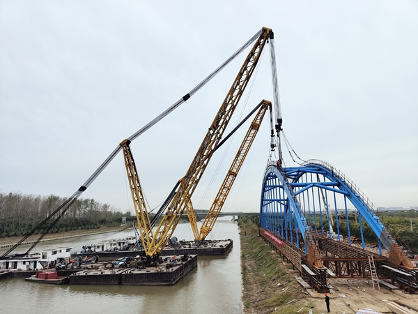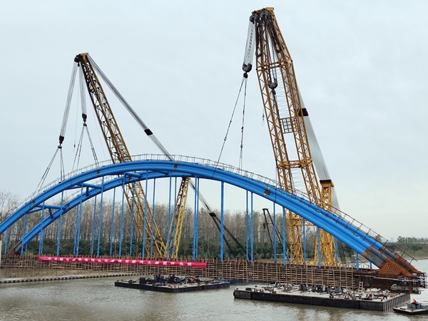 10月20日13時20分,在鹽城經開區德喜大橋施工現場,跨徑97米、重480噸的勁性骨架系桿拱在兩艘大型浮吊船的聯合起吊下,平穩安裝至主墩位置,完成主橋上部結構整體吊裝,標志著德喜大橋順利完成合龍,項目施工進入新的階段。