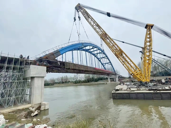 正式吊裝前,對作業區域范圍內封航,在上下游1千米外對來往船只進行管控。吊裝過程中,整體采用350噸和550噸的大船聯合吊裝,工人對吊點掛鉤,將主橋上部結構吊至一定高度懸空后,對橋身及模板等進行全面檢查加固。隨后,吊船繼續調轉船身,配合綁在橋墩上的四道鋼絲繩逐漸調整就位,吊船緩慢放下主橋上部結構,將拱腳與支座對正,平穩就位。最終,歷經4小時地緊張作業,吊裝圓滿完成,為后續橋梁的橋面系及附屬結構的施工等關鍵節點完成打下堅實基礎。