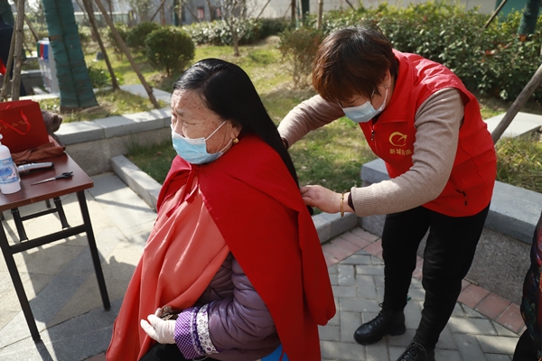 在志愿者們的引導(dǎo)下,居民們佩戴口罩,有序在一米線外等待。在“免費理發(fā)”點位,志愿者們熱情接待前來理發(fā)的每一位居民,并針對老年人、中年朋友分別設(shè)計不同的發(fā)型,手中銀剪上下翻飛,嫻熟精湛的技術(shù)讓居民精神面貌煥然一新,理發(fā)師傅一邊理發(fā)一邊與居民拉家常,增感情,現(xiàn)場氣氛溫馨活躍。