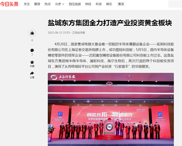 4月20日,國家集成電路大基金唯一控股的半導(dǎo)體薄膜設(shè)備企業(yè)——拓荊科技股份有限公司在上海證券交易所鳴鑼上市,成功登陸科創(chuàng)板;5月5日,國內(nèi)半導(dǎo)體設(shè)備精密零部件的領(lǐng)軍企業(yè)——沈陽富創(chuàng)精密設(shè)備股份有限公司科創(chuàng)板上市過會(huì),這將是鹽城東方集團(tuán)繼中微半導(dǎo)體、瀾起科技、海爾生物后,再次收獲的兩個(gè)科創(chuàng)板投資項(xiàng)目,演繹了從傳統(tǒng)城投平臺(tái)公司到產(chǎn)業(yè)投資“行家里手”的華麗蝶變。