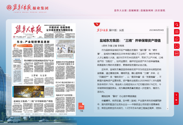 近日,鹽阜大眾報以《鹽城東方集團:“三精”并舉保障資產增值》為題,頭版重要位置報道了鹽城東方集團近年來不斷優化國有資產布局,改善國有資產管理效率與效果,有效實現了國有資產保值增值的生動實踐。
