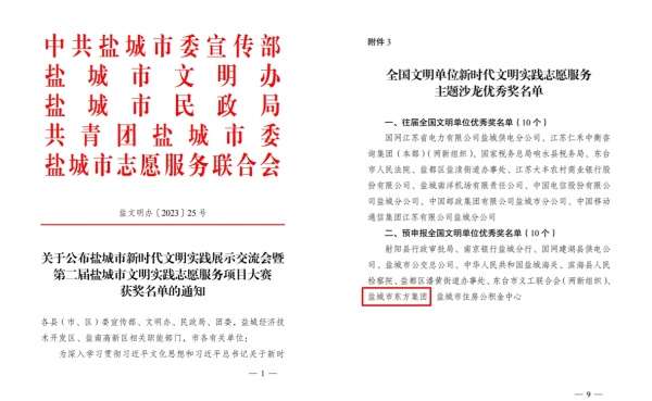 12月15日,鹽城市精神文明建設委員會辦公室發布《關于公布鹽城市新時代文明實踐展示交流會暨第二屆鹽城市文明實踐志愿服務項目大賽獲獎名單的通知》,鹽城東方集團榮膺“全國文明單位新時代文明實踐志愿服務主題沙龍優秀獎”,名列“預申報全國文明單位優秀獎名單”前10名。