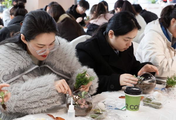微景觀盆栽DIY成為本次活動最受追捧的環節。青年們把該活動作為傳遞綠色環保理念的獨特載體,充分發揮自己的創意和想象力,踏上了綠色環保藝術的奇幻之旅。他們將多肉植物、苔蘚與多種回收材料巧妙結合,成功打造出40多個生機盎然的“微型生態圈”,以藝術形式完美詮釋了環保智慧。