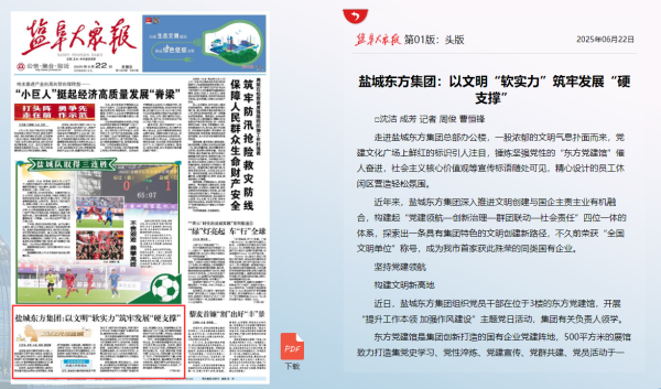 昨天,《鹽阜大眾報》在01版倒頭條發布《鹽城東方集團:以文明“軟實力”筑牢發展“硬支撐”》文章,濃情點贊鹽城東方集團喜獲“全國文明單位”殊榮。全文如下: