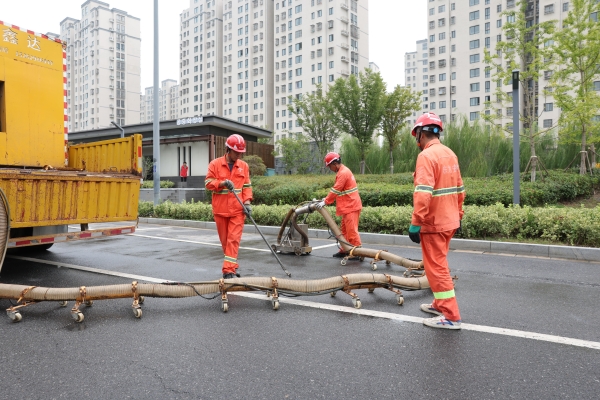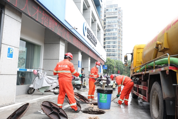 在建行開發區支行門口,一群身著橙紅工裝、頭戴安全帽的工人師傅,正在濕潤的路面上開啟井蓋,細致清掏淤積的油污雜物,黑色垃圾袋很快被殘渣填滿……地面水跡反光映出他們彎腰忙碌的身影,遠處高樓的寧靜與近處器械的轟鳴形成了鮮明對比。