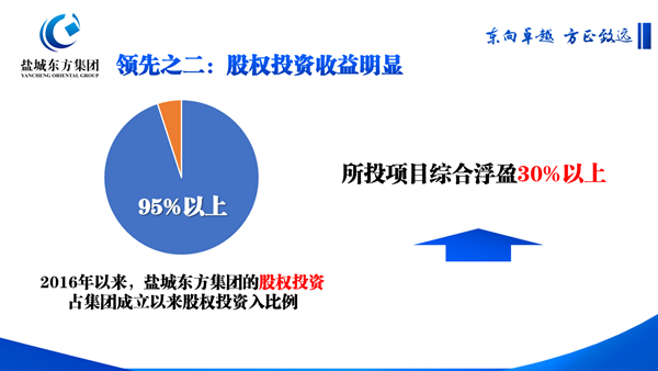 2016年以來,鹽城東方集團立足區(qū)內(nèi)、瞄準上海,先后高效推進20多個股權(quán)投資項目,占集團成立以來股權(quán)投資的95%以上。由于強化了前期盡責調(diào)查、中期風險防控、優(yōu)化投后管理,所投項目綜合浮盈超30%。