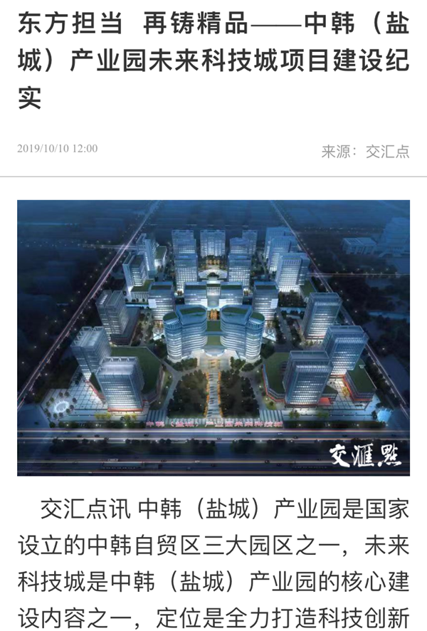 中韓(鹽城)產業園是國家設立的中韓自貿區三大園區之一,未來科技城是中韓(鹽城)產業園的核心建設內容之一,定位是全力打造科技創新核心區、活力雙創區、總部研發區、商務政務區、高端配套區,計劃建設開放時間為2020年6月底。面臨責任重、要求高、時間緊的政治任務,曾經打造過國際會展中心、北師大鹽城附校等精品工程,創下東方速度、東方奇跡的鹽城東方集團清醒的意識到,高點起跳、高速躍進,沒有一股子闖勁不行!