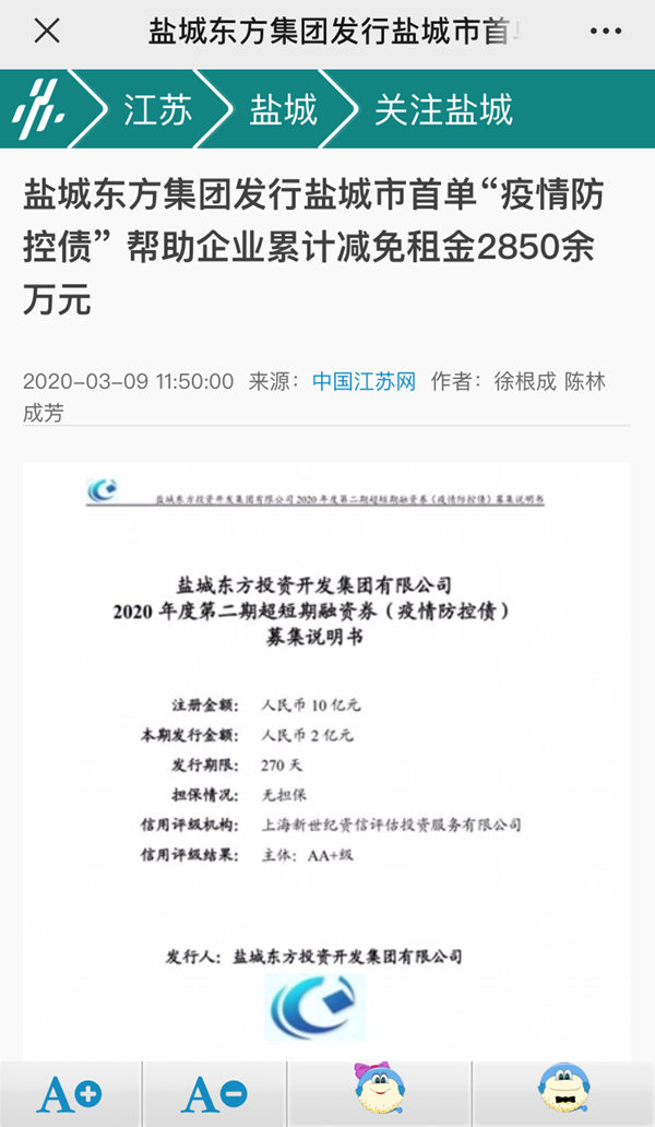 鹽城東方集團(tuán)成功發(fā)行鹽城市首單“疫情防控債”,同時創(chuàng)下該集團(tuán)近三年來發(fā)債最低成本。3月9日,“交匯點”客戶端、中國江蘇網(wǎng)等省市媒體相繼聚焦報道東方集團(tuán)金融戰(zhàn)“疫”的成果。