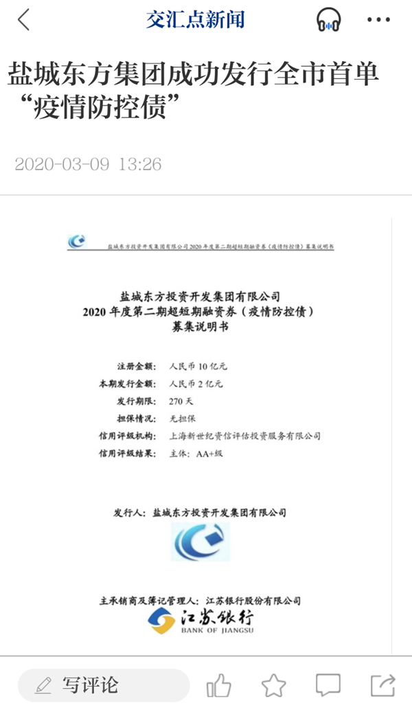 本次發(fā)債工作得到了市地方金融監(jiān)管局、人民銀行鹽城市中心支行、鹽城銀保監(jiān)分局等監(jiān)管部門的大力支持,鹽城東方集團(tuán)和江蘇銀行鹽城分行主要負(fù)責(zé)人更是親自掛帥,成立專項工作組,高效組織發(fā)行材料,迅速完成審批流程,及時開展市場簿記,積極搭建認(rèn)購平臺,受到了投資人的踴躍認(rèn)購。經(jīng)過超前謀劃和共同努力,借助交易商協(xié)會疫情防控專項債務(wù)融資工具注冊發(fā)行“綠色通道”,申報后一周內(nèi)就獲得批文,成功簿記了本次2億元的“疫情防控債”,為全市同類企業(yè)相關(guān)債券發(fā)行探索出一條新路。