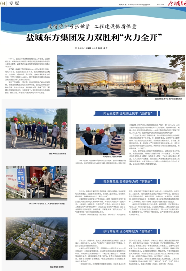 8月13日,今日開發區報以《疫情防控弓張弦緊 工程建設保質保量——鹽城東方集團發力雙勝利“火力全開”》為題,整版報道鹽城東方集團疫情防控和工程建設“兩手抓、兩不誤”,奮力奪取“雙勝利”的主要舉措。