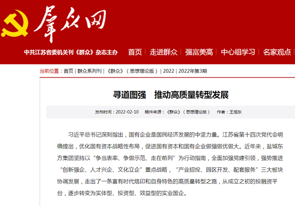 近日,由中共江蘇省委主辦的《群眾》雜志(思想理論版)2022年3月刊“社會建設(shè)”欄目刊登王旭東董事長署名文章——《尋道圖強 推動高質(zhì)量轉(zhuǎn)型發(fā)展》。