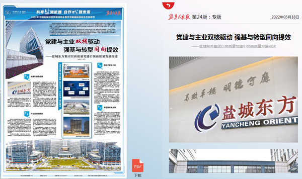 今天,鹽阜大眾報以《黨建與主業雙核驅動 強基與轉型同向提效》為題,整版聚焦報道鹽城東方集團堅持黨的領導和加強黨的建設,貫穿國企改革發展全過程,引領實現高質量跨越式發展的成果。