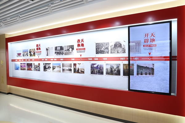 展陳方式守正創新。堅持把時間與空間相結合、呈現與再現相結合、技術與藝術相結合的原則,保證展陳政治性、思想性、藝術性有機統一。在致力提升現有照片的清晰度、版面設計全力優化、盡可能使用視頻便于及時動態更新的基礎上,穿插使用了多種彰顯科技含量的現代展陳方式,包括用滑軌屏播放黨史素材、長弧屏推介集團發展大事記、L幕展示發展亮點、懸掛屏滾動呈現先進人物等。其中,在第一展廳中通過滑軌屏定時插放毛主席在開國大典上講話情景再現的10分鐘視頻,讓受眾感到熱血沸騰、激情滿懷;L幕推送的《卓越東方·產業引擎》3D動畫和發展情景的深度融合,讓人身臨其境、精神振奮。