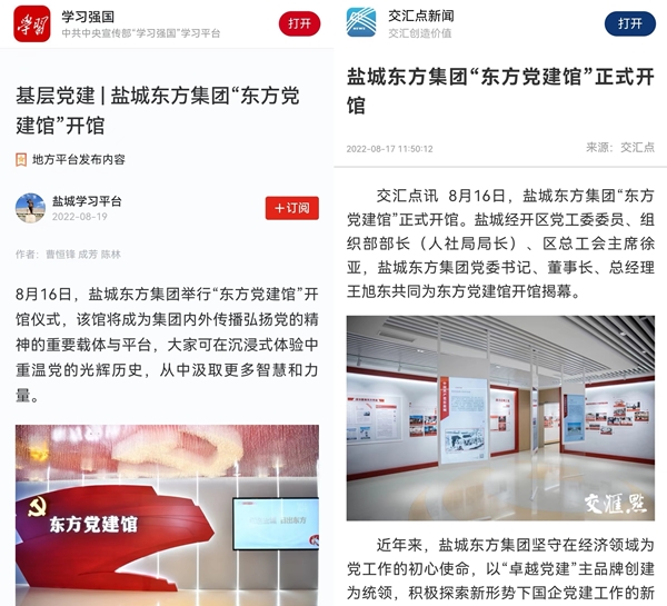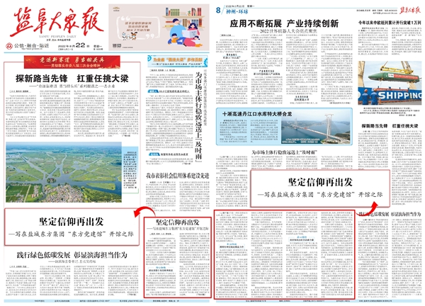 8月17日,“交匯點”新聞、鹽城新聞網發布《鹽城東方集團“東方黨建館”正式開館》,今天,《鹽阜大眾報》頭版、“我鹽新聞”客戶端、鹽城新聞網相繼發布《堅定信仰再出發——寫在鹽城東方集團‘東方黨建館’開館之際》文章,大篇幅、多角度地呈現了鹽城東方集團以黨建為引領,不斷深化黨建與業務融合,培育特色鮮明的黨建品牌,打造黨性教育的主陣地、主題活動的大課堂、黨群融合的新平臺的幕后故事和亮點成果。