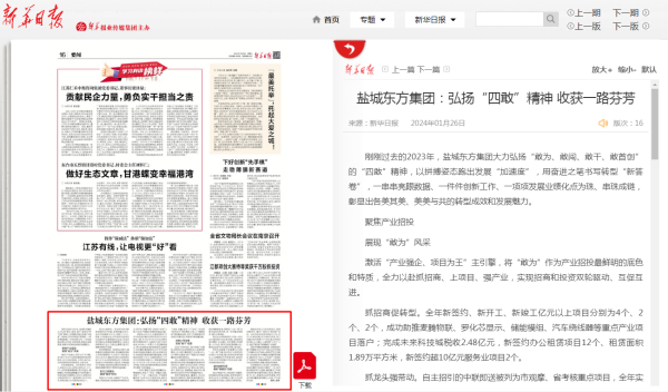 編者按:1月26日,新華日報第16版“要聞”發布《鹽城東方集團:弘揚“四敢”精神 收獲一路芬芳》文章,報道2023年度鹽城東方集團取得的發展成果,生動展現了集團一路足音鏗鏘,以“四敢”精神,只爭朝夕、不負韶華,描繪高質量發展的奮斗圖景。