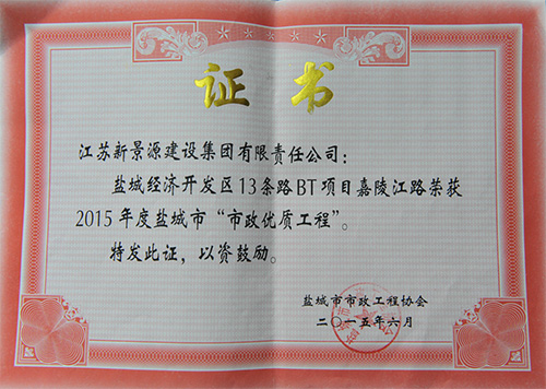 東方市政公司承建的鹽城經(jīng)濟技術(shù)開發(fā)區(qū)13條路BT項目嘉陵江路、岷江路榮獲2015年度鹽城市“市政優(yōu)質(zhì)工程”