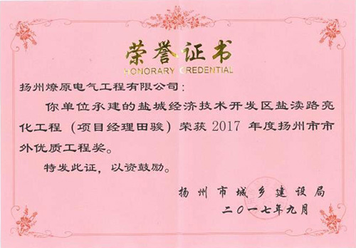 東方市政公司承建的鹽城經(jīng)濟技術(shù)開發(fā)區(qū)鹽瀆路亮化工程榮獲2017年度揚州市市外優(yōu)質(zhì)工程獎
