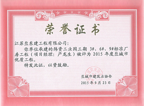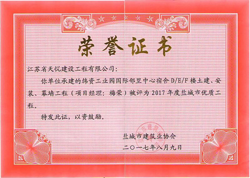 東方置業(yè)公司承建的韓資工業(yè)園鄰里中心宿舍D/E/F樓土建、安裝、幕墻工程榮獲2017年度鹽城市優(yōu)質(zhì)工程獎