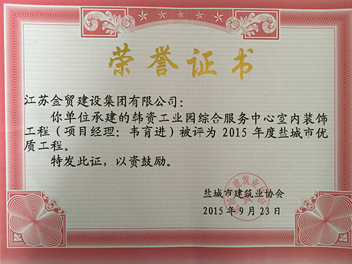 韓資工業(yè)園服務(wù)中心內(nèi)裝飾工程榮獲2015年度鹽城市優(yōu)質(zhì)工程