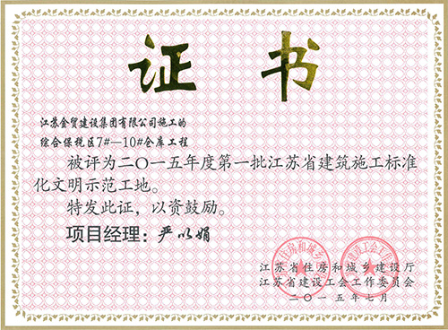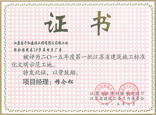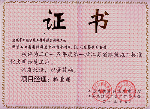 悅欣花園住宅樓(含人防)土建、安裝工程和北師大鹽城附校幼兒園、小學(xué)部榮獲三星級施工標(biāo)準(zhǔn)化工地,北師大鹽城附校(初中、高中部)、東方之洲B9、B10土建工程、鹽城綜保區(qū)二期封關(guān)新建倉庫和新建標(biāo)廠、韓資工業(yè)園五期標(biāo)廠榮獲一星級施工標(biāo)準(zhǔn)化工地。