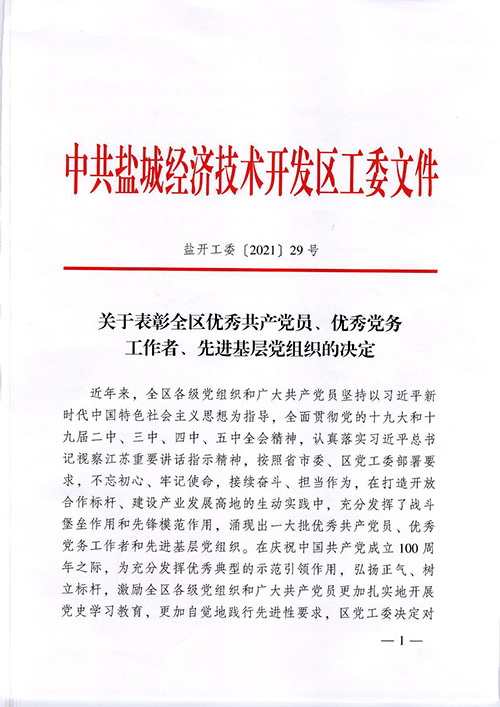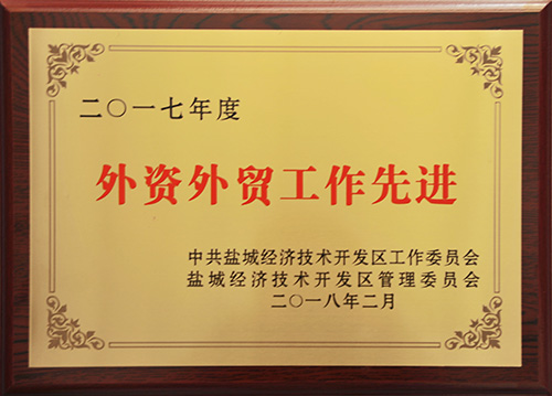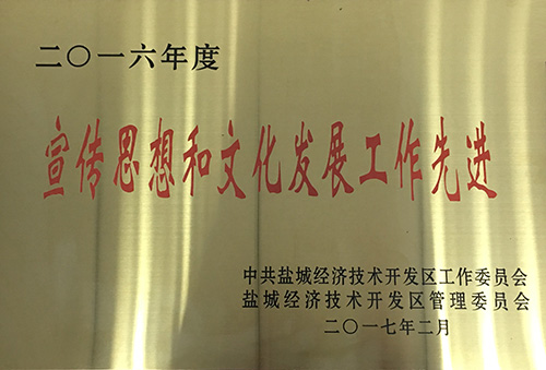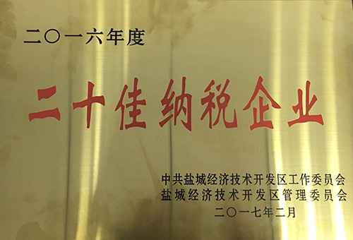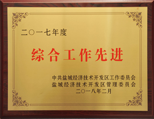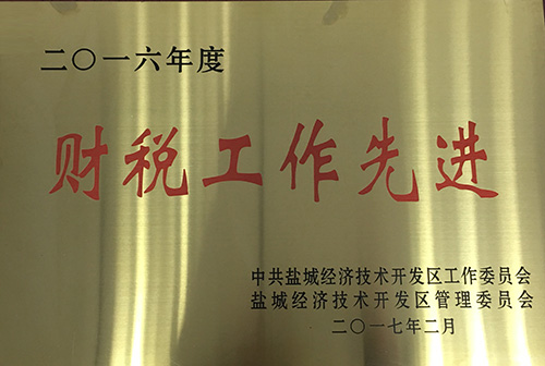 榮獲2016年度鹽城經(jīng)濟技術(shù)開發(fā)區(qū)二十佳納稅企業(yè)、項目推進(jìn)工作先進(jìn)集體、園區(qū)發(fā)展和開放型經(jīng)濟工作先進(jìn)集體、民生幸福和社會事業(yè)先進(jìn)工作集體、生態(tài)文明建設(shè)和環(huán)境保護(hù)工作先進(jìn)集體、宣傳思想和文化發(fā)展工作先進(jìn)集體、財稅工作先進(jìn)集體七項集體表彰
