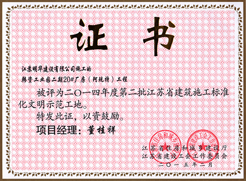 東方置業(yè)公司承建的韓資園二期20#廠房(阿現(xiàn)特)工程榮獲2014年度第一批江蘇省建筑施工標(biāo)準(zhǔn)化文明示范工地
