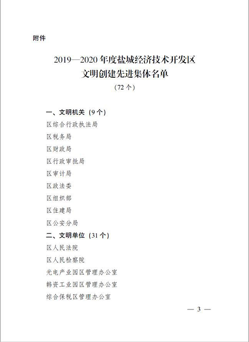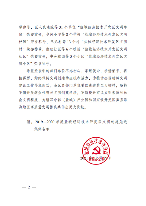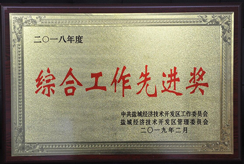 榮獲2019年度鹽城經(jīng)濟技術(shù)開發(fā)區(qū)綜合工作先進(jìn)獎。